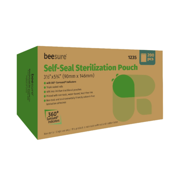 BeeSure Self-Seal Sterilization Pouches feature built-in steam and gas 360 degree-Surround process indicators. Triple-sealed rails ensure security and tear-resistance. Plus, corner tack seals prevent curling and separation after sterilization. Water-based, lead-free links and solvent-free lamination adhesives are environmentally-friendly and non-toxic. 200 pouches per box.