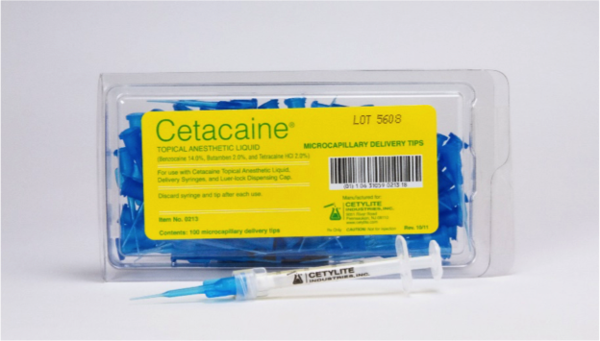 Cetacaine Topical Anesthetic offers three active ingredients to control pain and ease discomfort during dental and medical procedures. Cetacaine is indicated for uses on all accessible mucous membrane ecept the eyes. Has a rapid onset; with a duration of 30-60 minutes when used as directed. Not for injection. Pleasant banana flavor. Rx only.