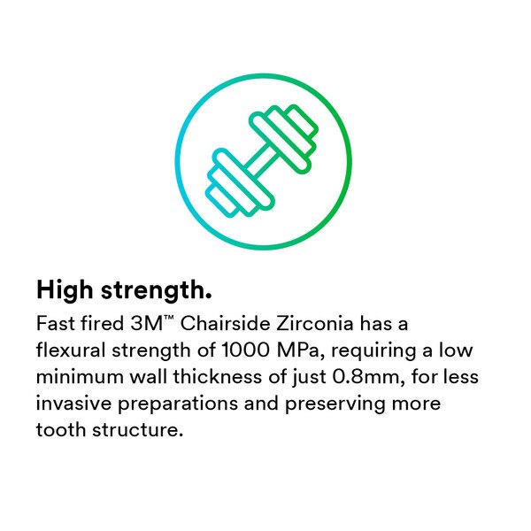 3Mâ„¢ Chairside Zirconia, a new CAD/CAM zirconia block for the CEREC SpeedFire furnace, offers a well-balanced, high strength, esthetic option for single-unit crowns and 3-unit bridges.