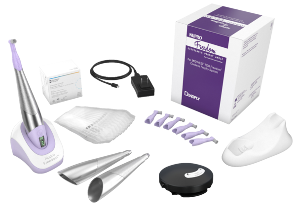 This package consists of the inner module, three autoclavable outer sheaths, wireless foot pedal, handpiece cradle, charging base, power supply, operator manual, 200 Nupro Freedom Disposable Prophy Angles and 500 Disposa-Shield polyethelene barriers. Also included* is over $350 SRP worth of accessories to protect the clinician and the patient. Accessories include Nupro Freedom Disposable Prophy Packs, Nupro Extra Care Prophy Paste Cups, Com-Fit Plush Natural Fit Masks, VoloWipes Disinfectant Wipes, Moist Sure Liquid Hand Sanitizer and FlashTips Disposable Air/Water Syringe Tips.
