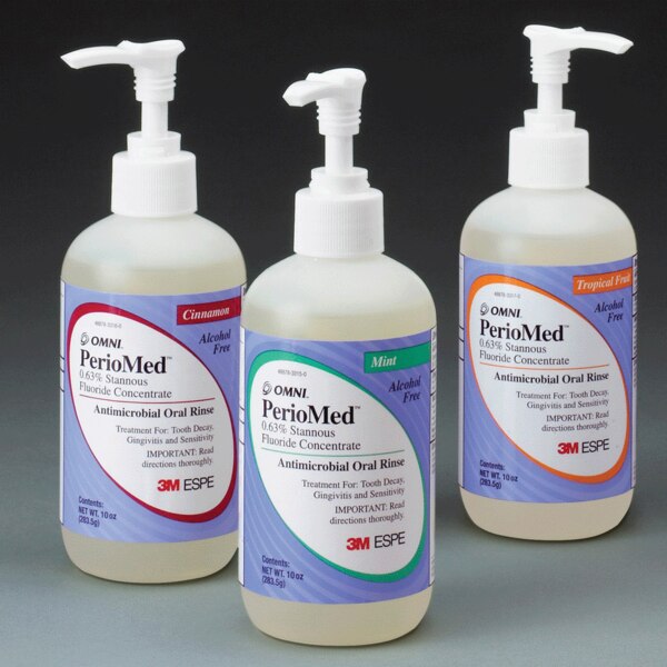 3M™ PerioMed™ 0.63% Stannous Fluoride Oral Rinse Concentrate provides antimicrobial activity for up to 8 hours and costs about the same as the leading over-the-counter mouthwashes. Refill includes 24 - 10 oz bottles with pump in mint flavor. Note: the %w/v fluoride ion of this product is 0.19.