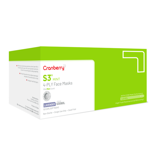 Cranberry S3 Mint Premium Face Mask 50/Bx Lavender ASTM 3