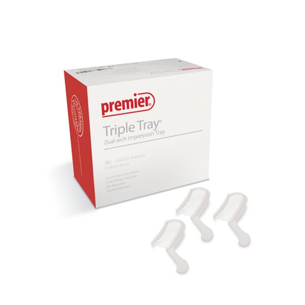 All Premier® Triple Tray® impression designs have very thin, loose webbing which will not distort when the patient closes. Look for Premier on the handle, your assurance of a genuine dental Triple Tray. The superior performance of Triple Tray, combined with high-quality and accurately engineered materials, provides you with an ideal impression in an easy technique. Triple Tray has been consistently rated an outstanding dental product by a leading independent research organization due to “least water sorption and thinnest interocclusal wafer…”1 and has provided dental practices around the world with over 185 million accurate triple tray impressions.